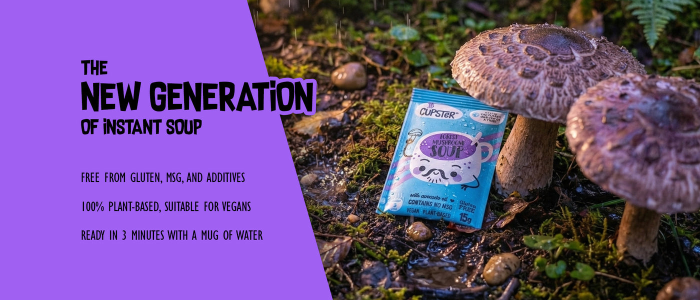 Cupsters vegane Pilzsuppe zum Sofortgenuss mit glutenfreien Nudeln, für Wanderer im Wald! Dieses Produkt ist praktisch (in einer handlichen Verpackung!) wenn Sie eine schnelle Mahlzeit brauchen, aber nicht auf Ihre besondere Ernährung verzichten möchten oder eine sauberere Alternative suchen. Probieren Sie die neue Generation der Sofortsuppen!